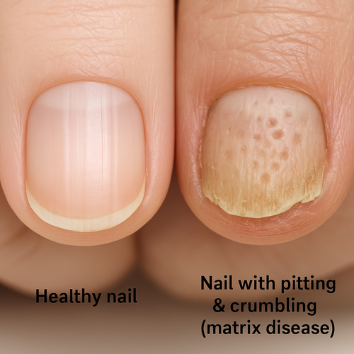 What happens: Psoriasis speeds-up cell growth in this tiny “factory,” so the nail plate comes out uneven. That causes pitting (little dents), white spots, thick or crumbly nails, and sometimes a ragged cuticle.