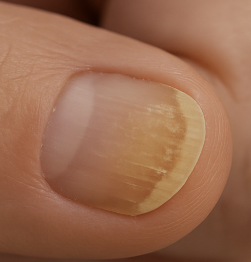 Nail lifting, yellow “oil-drop” stain, chalky debris under the tip (Bed-type)
